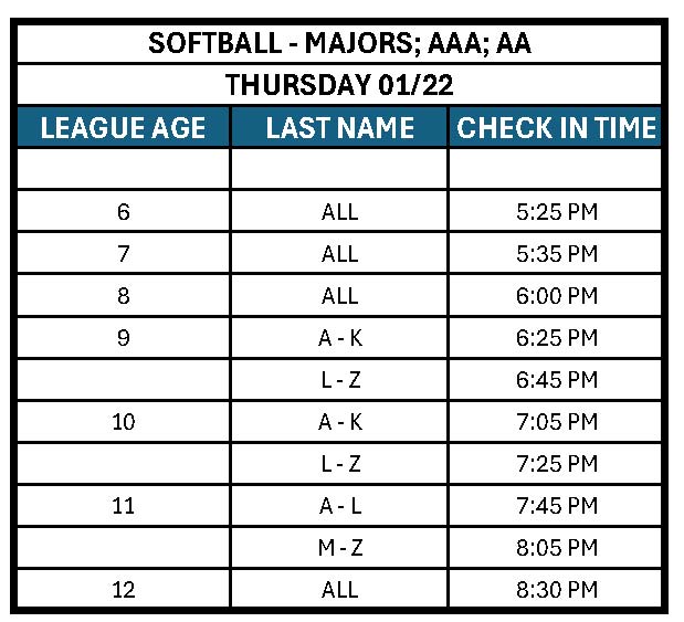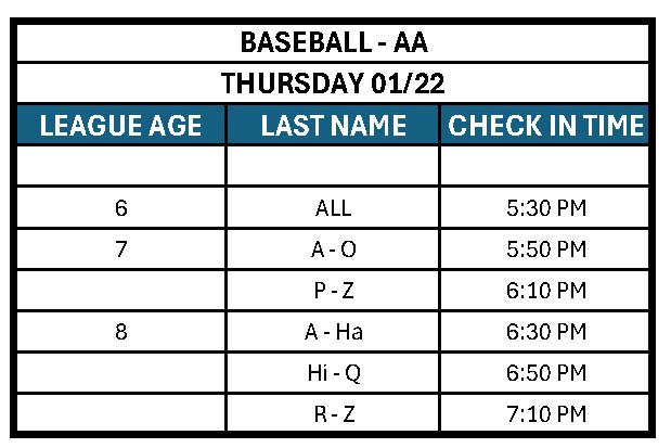 Please use the following chart to find your player's check-in time. This year the schedule is arranged by League Age and then the start of your Last Name - this is in an attempt to reduce the amount of time players will be waiting. It is very important for each player to make every effort to arrive during your scheduled time.
