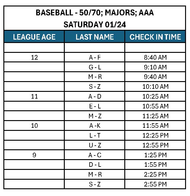 SATURDAY JANUARY 24, 2026 - 50/70/MAJORS/AAA BASEBALL EVALUATION SCHEDULE