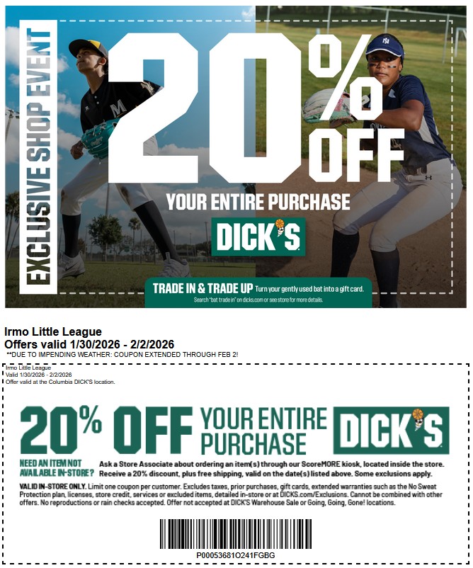 We are thrilled to announce that DICK'S Sporting Goods is a sponsor for Irmo Little League! As part of their sponsorship, they are offering our participants the opportunity to shop in-store with a 20% off coupon* valid January 23rd - 26th, as well as January 30th - February 2nd and February 6th - 9th due to inclement weather in our area the past two weekends.