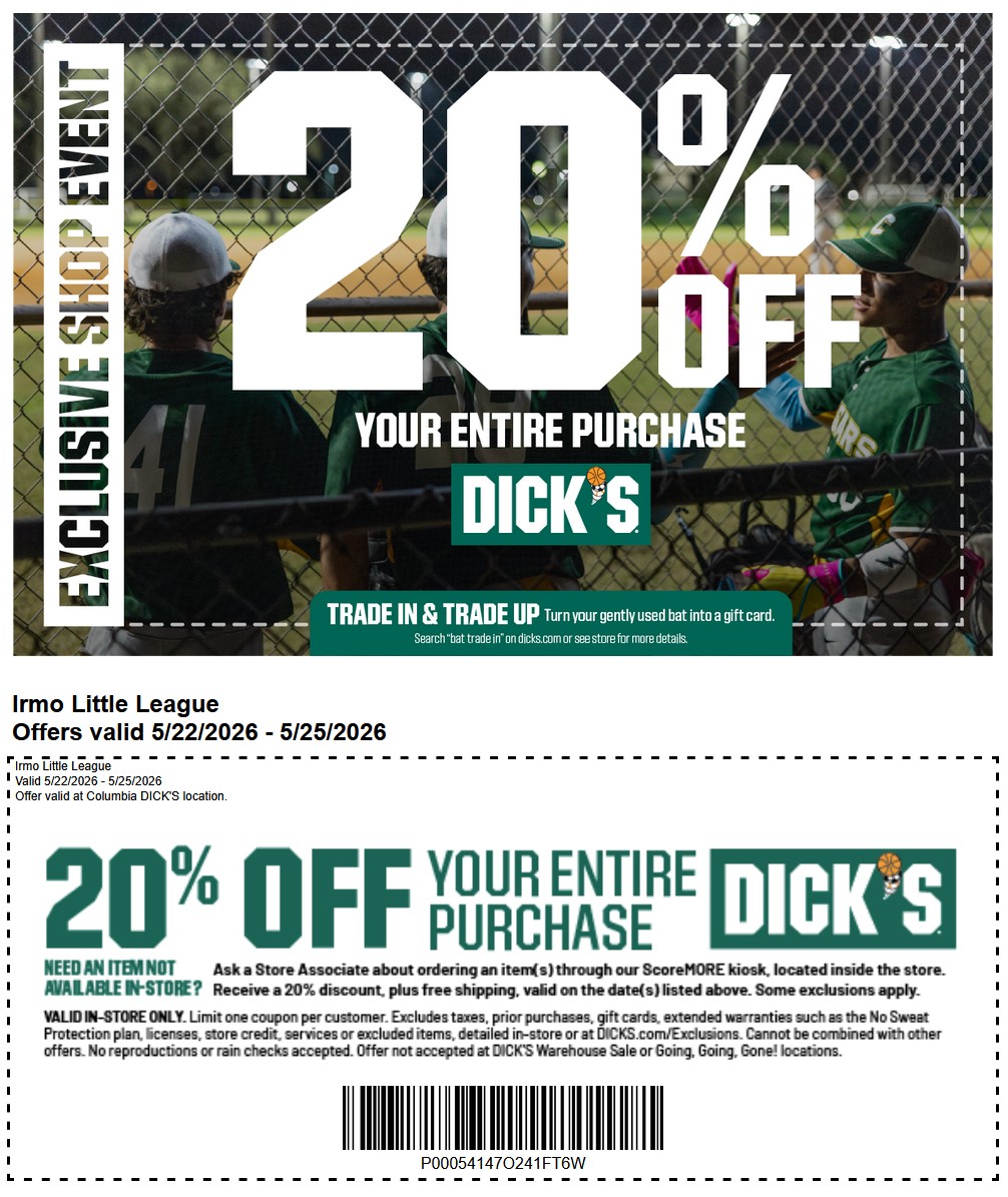 Back again! DICK'S Sporting Goods is offering our players a SECOND shop weekend in-store with a 20% off coupon* valid May 22nd - 25th.