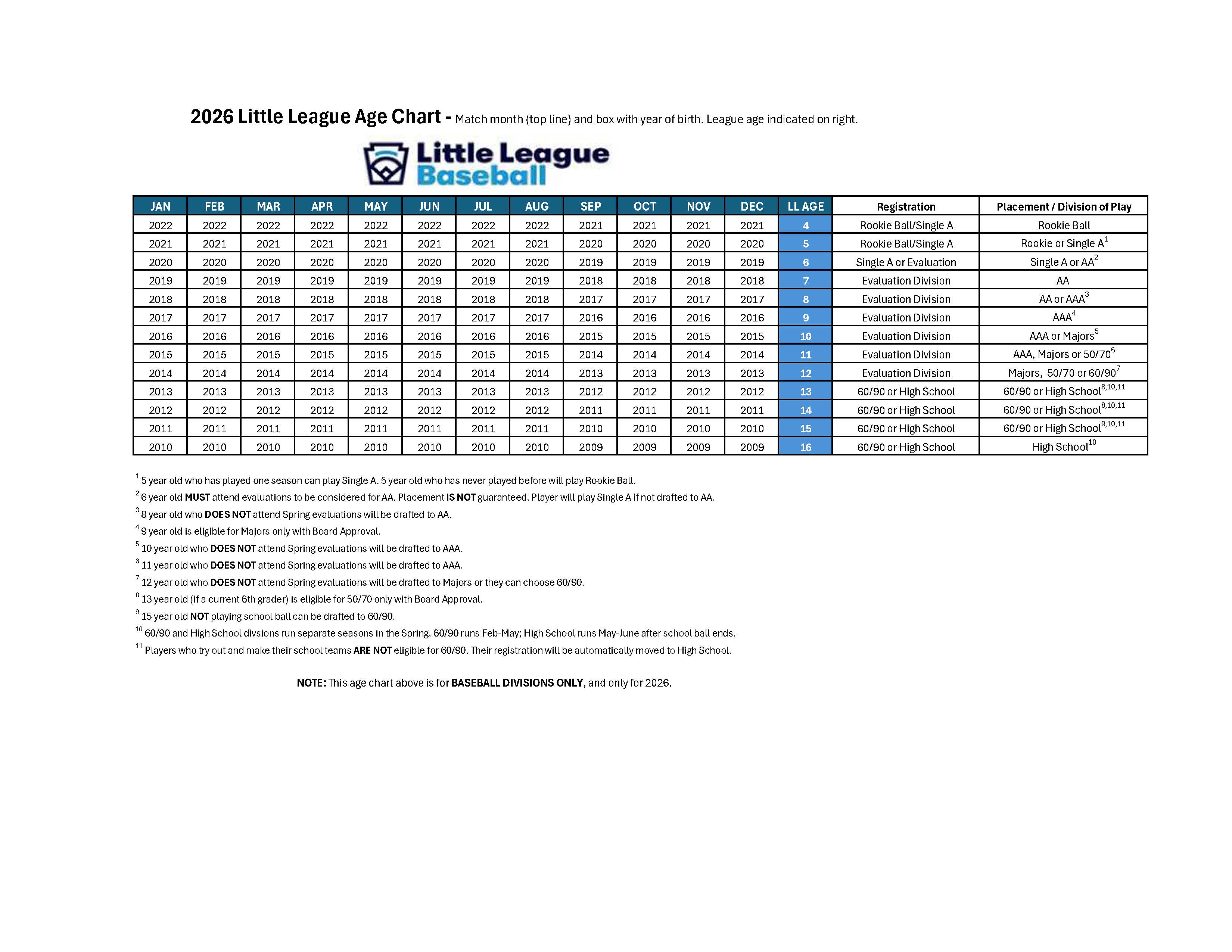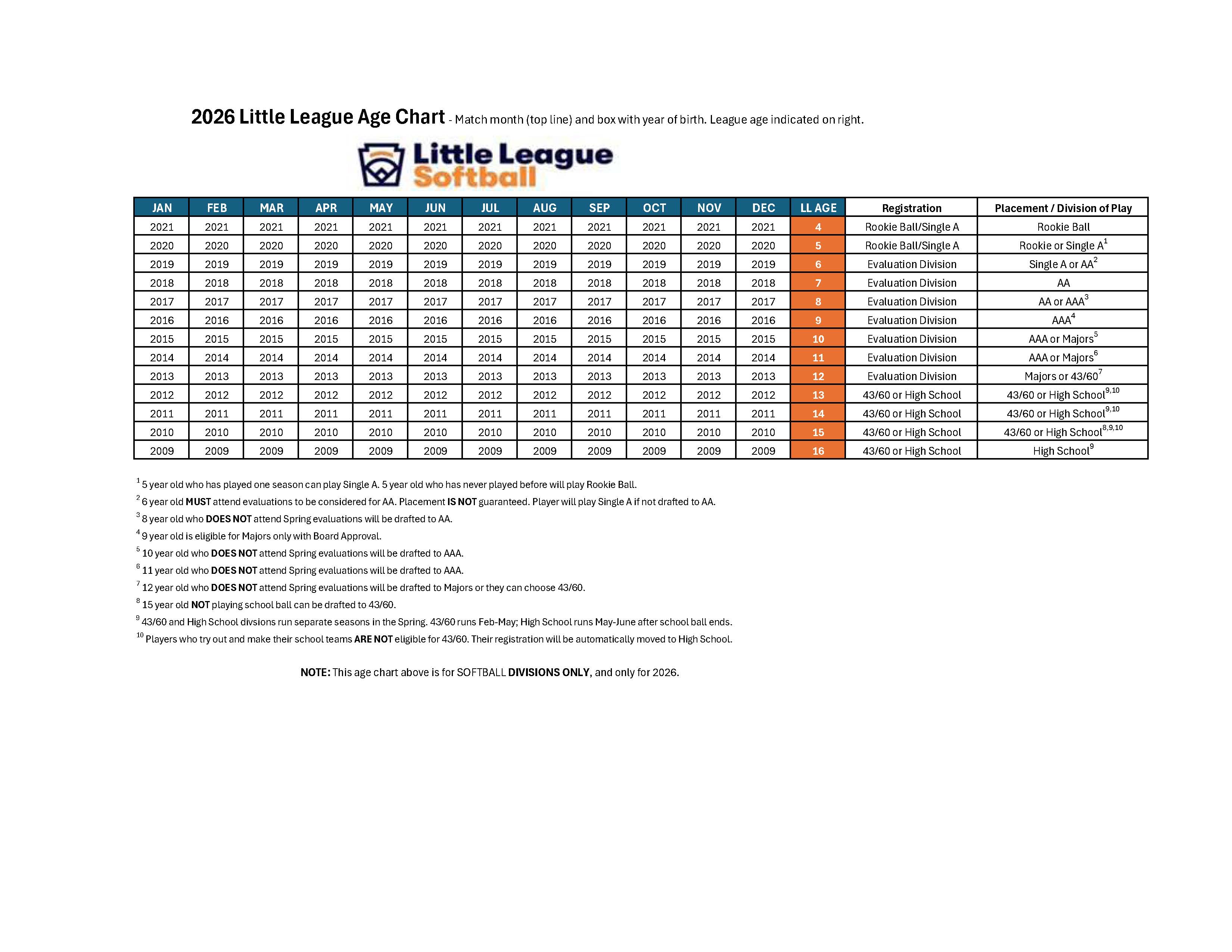 Baseball and Softball divisions utilize different age calendars for their respective sports. Please refer to the charts, below, to help determine a player's league age for the 2026 Spring and Fall seasons. You may also use the Little League International Age Calculator. For more information on the various placements/divisions for baseball and softball, please read through the Divisions of Play