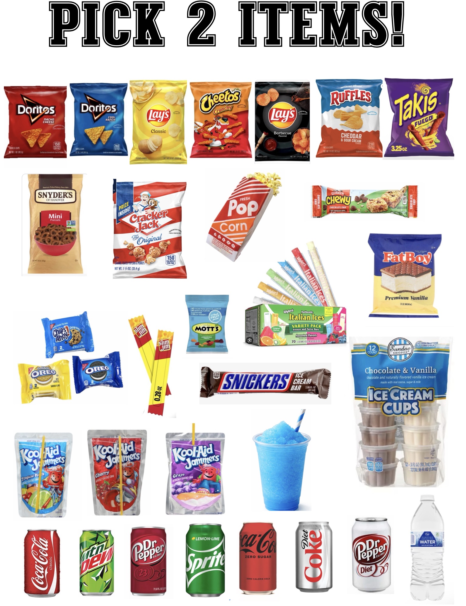 This year, snack tickets were included in registration fees for all regular season games. After your players finish their game, as a team, they should head to the concession stand to pick their TWO snack ticket items from the approved list. Please see below for approved items.